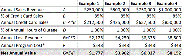 When your Internet goes down, how much does it cost you in revenue, customer dissatisfaction and loyalty? While it's difficult to calculate customer dissatisfaction and loyalty, the following table that assumes that your Internet is up 99% of the time.